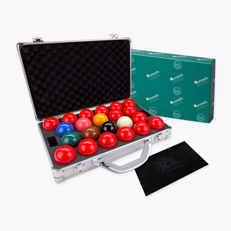 Aramith Premier 2 1/16" Full Size 22 Snooker Balls with Baize Master Silver Ball Case and Towel