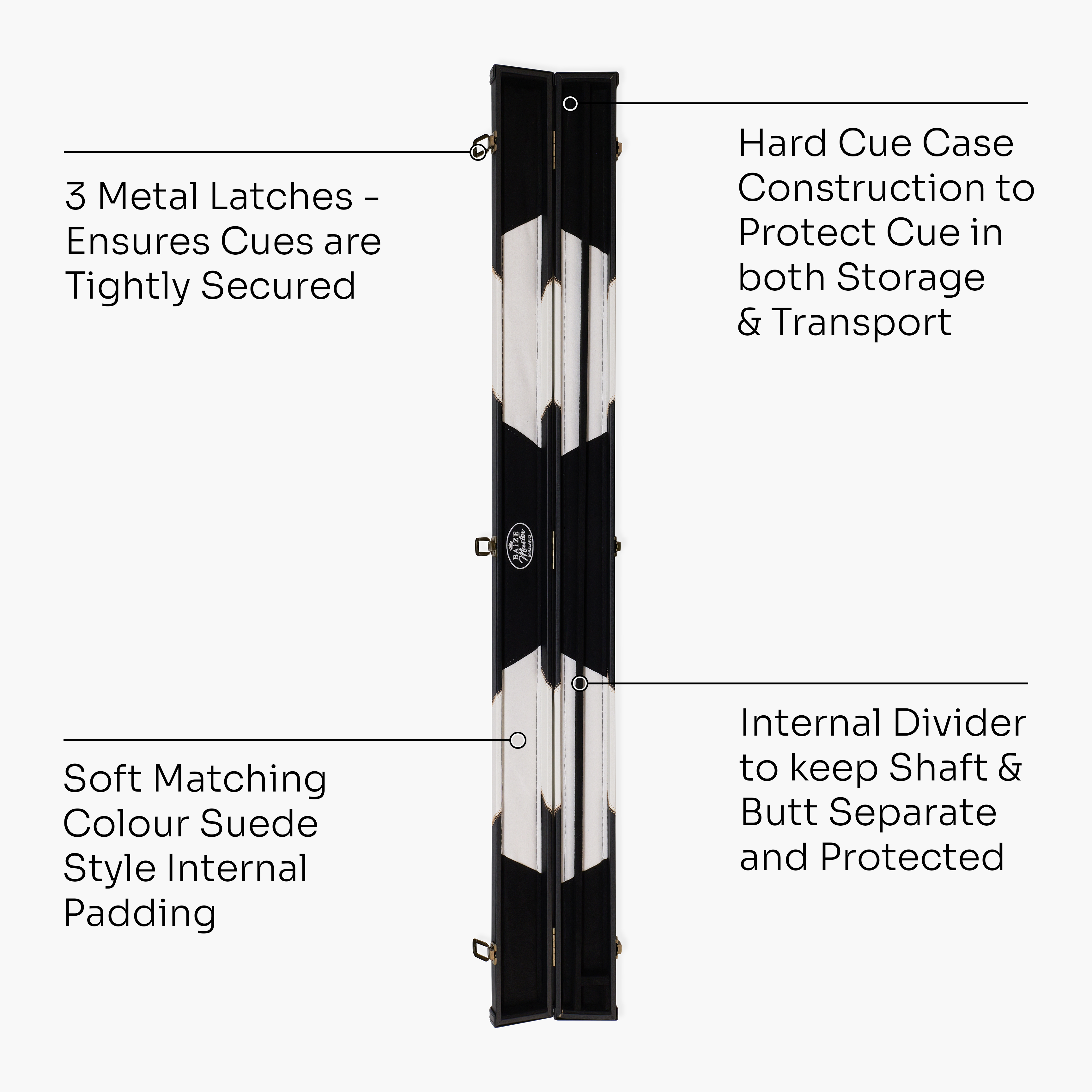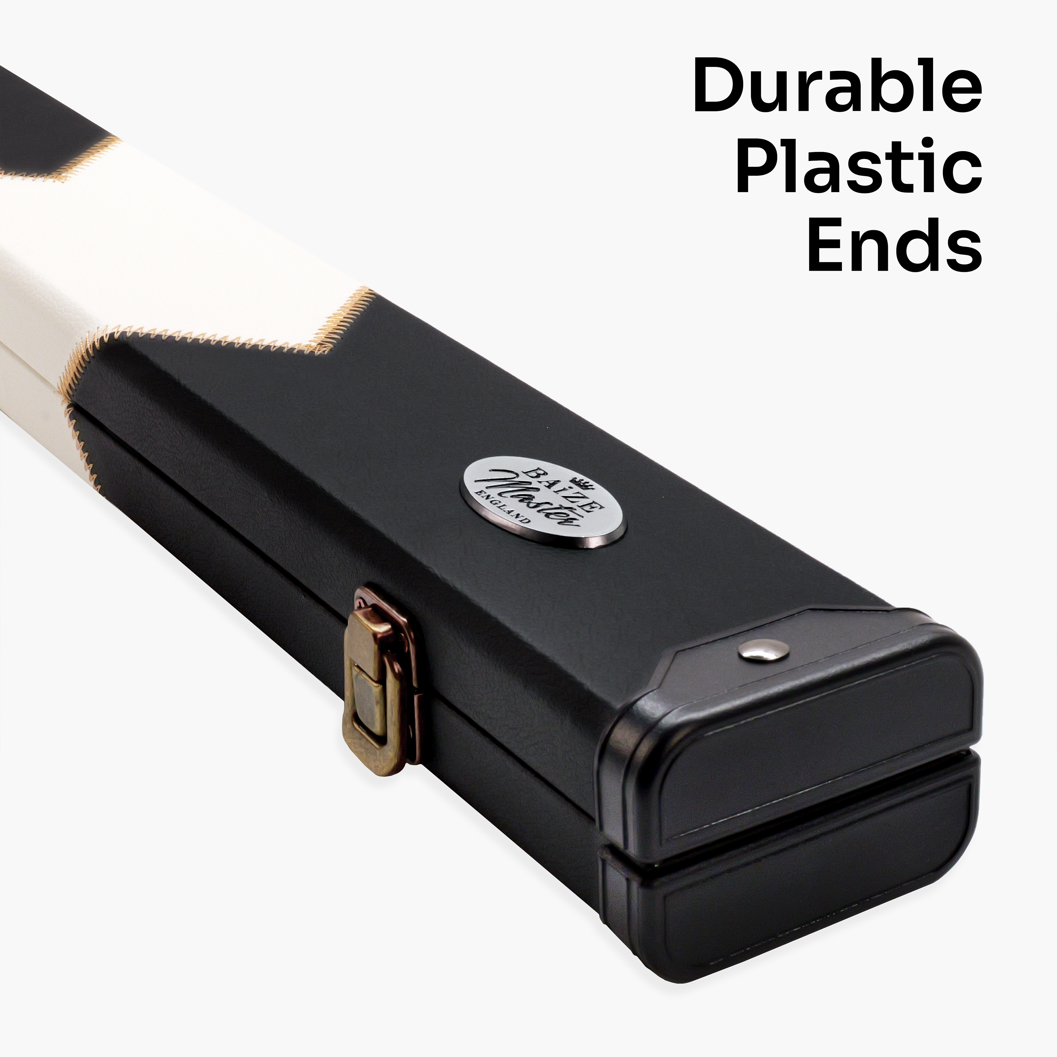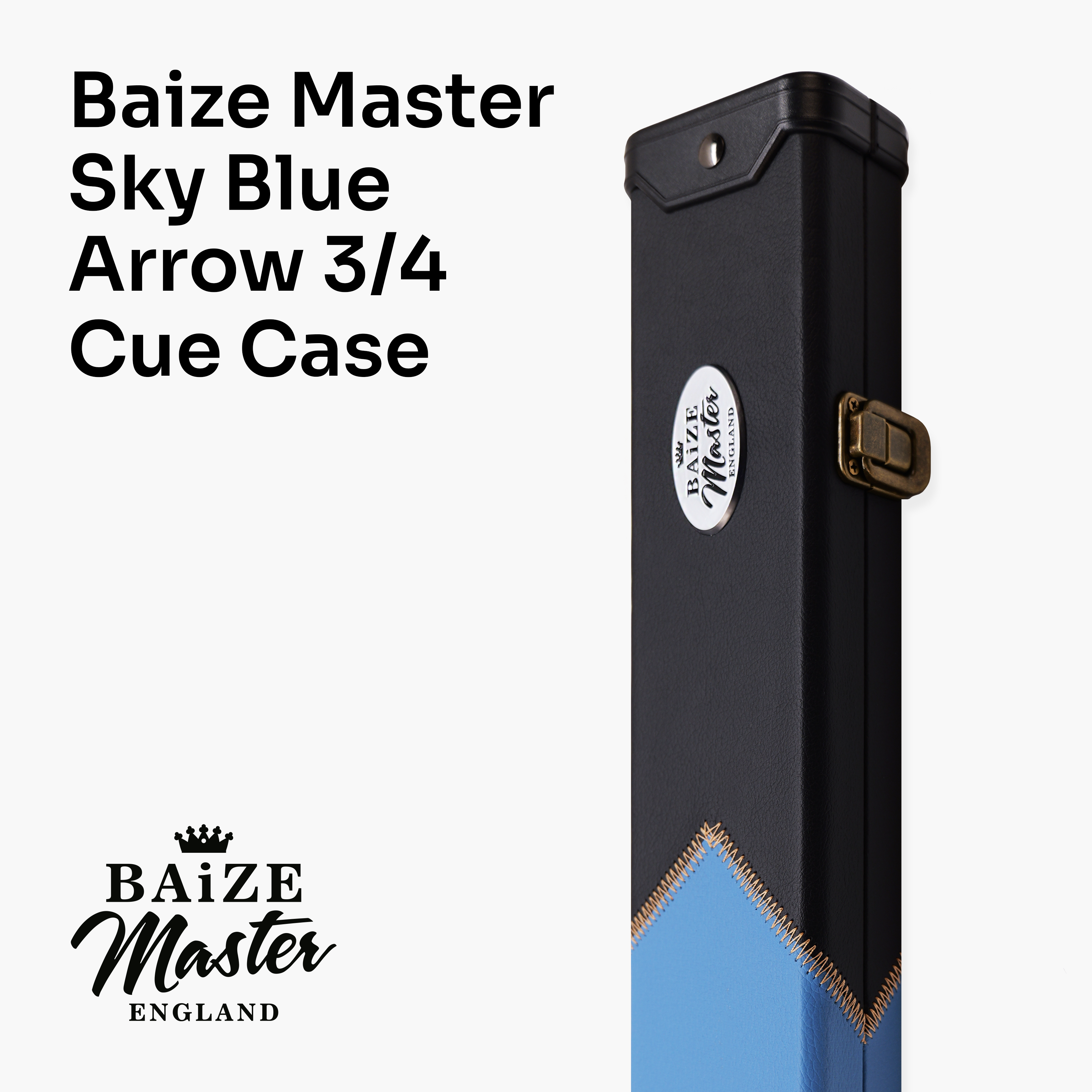 Our deluxe Baize Master 3/4 cue cases feature chunky plastic ends for improved protection mixed with a distinctive arrow patch design for an overall, highly desirable cue case. They can comfortably hold 1 x ¾ joint cue, a long telescopic extension and a mini butt. These cases have an internal chalk compartment and matching suede style padded interiors which will hold your cue tightly in place. Finished with a quality exterior Baize Master metal badge and internal Baize Master embroidered logo.