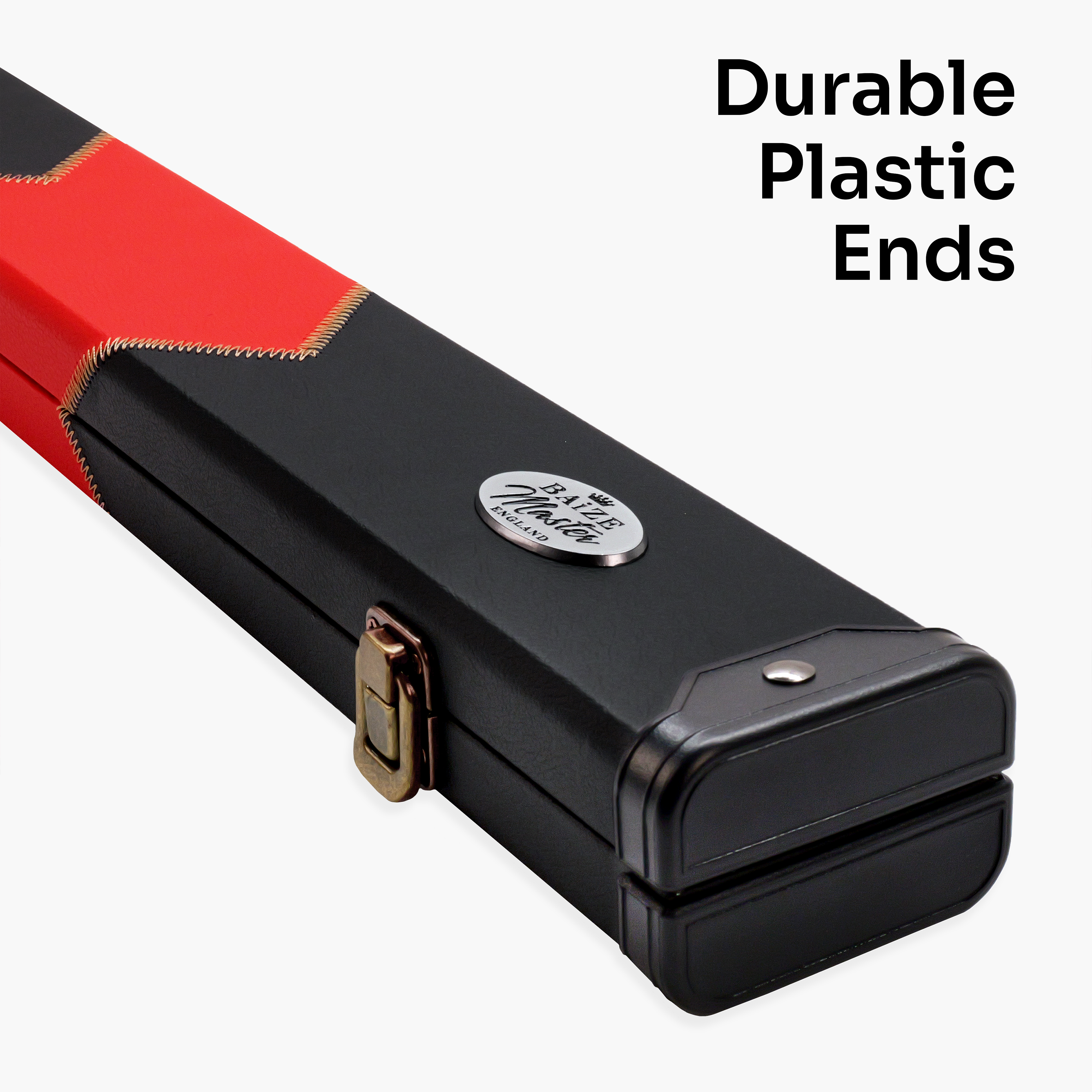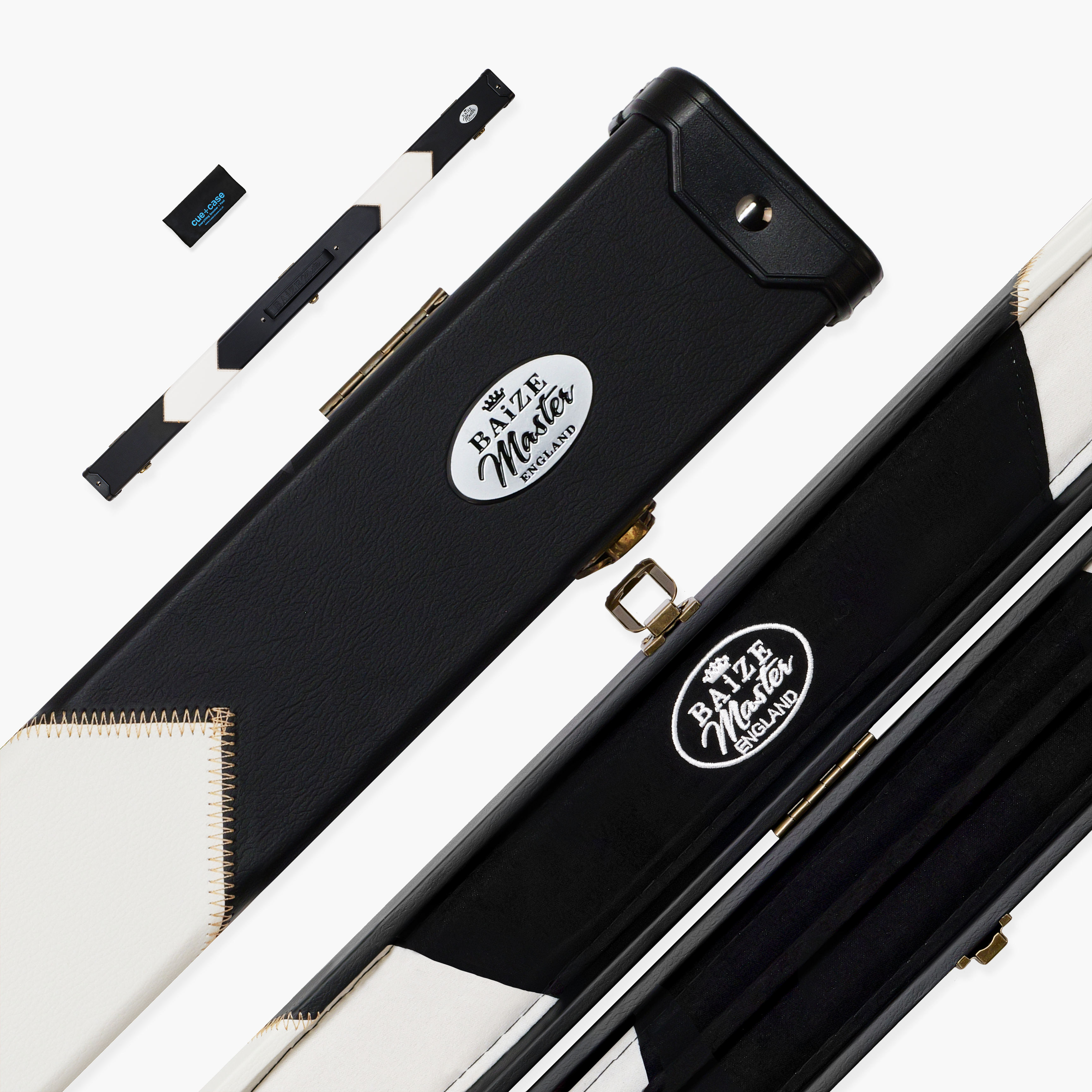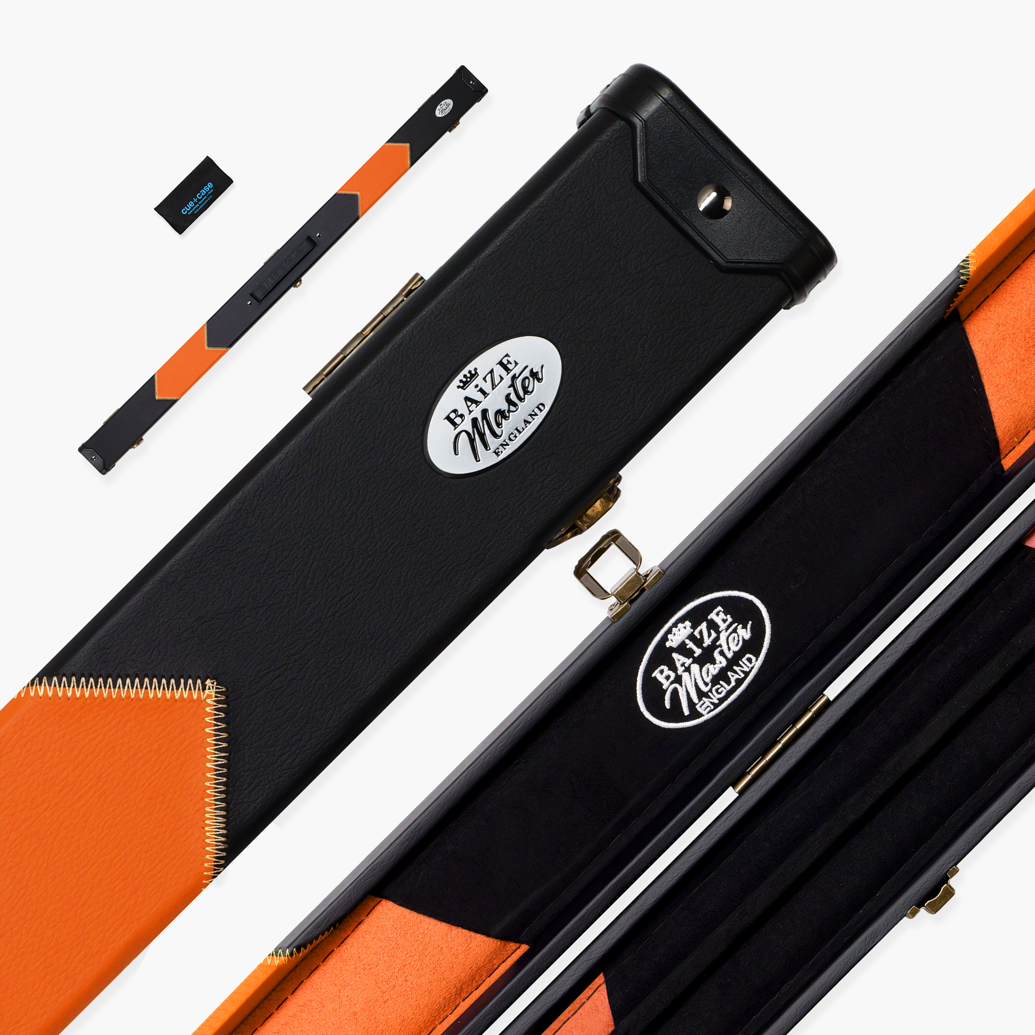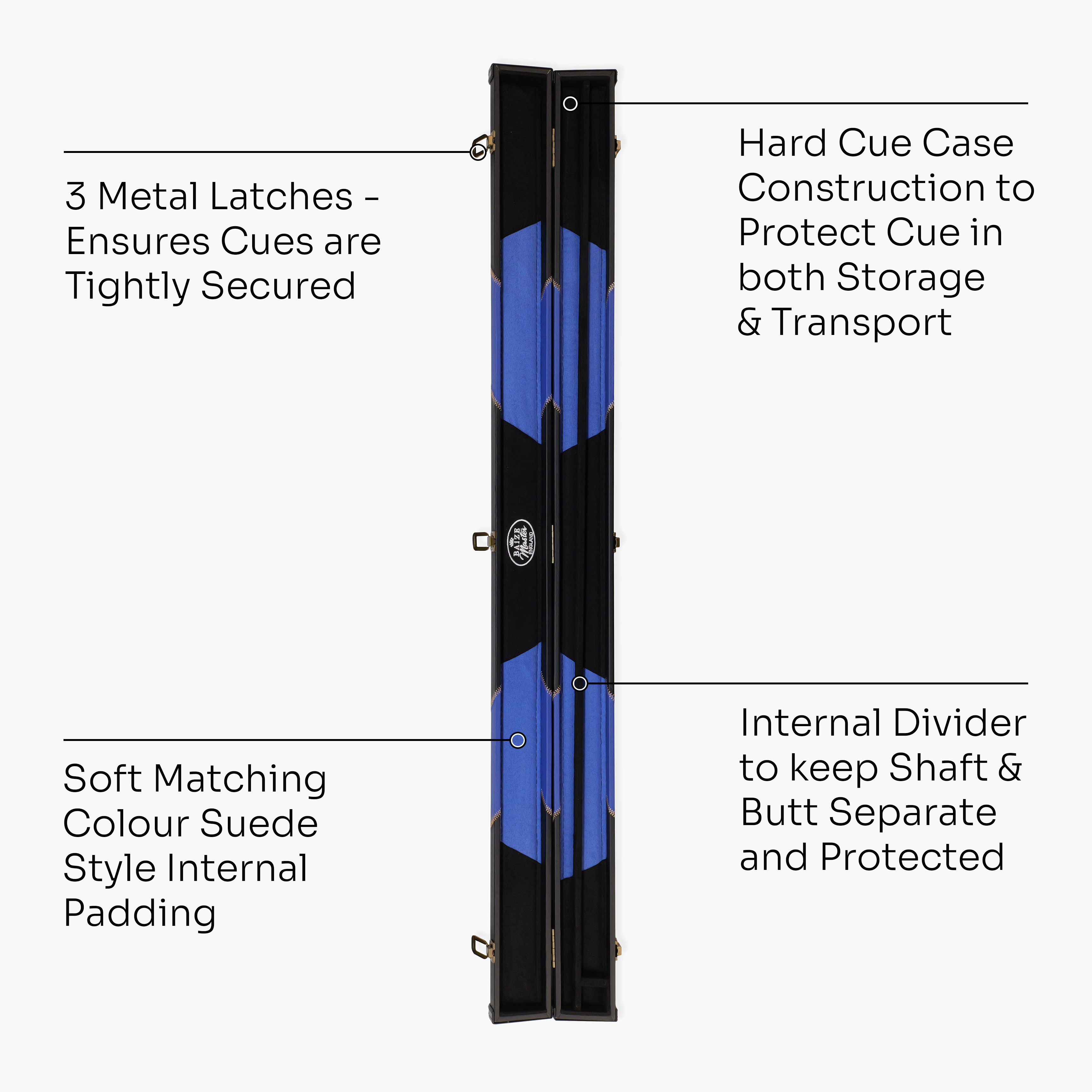 Our deluxe Baize Master 3/4 cue cases feature chunky plastic ends for improved protection mixed with a distinctive arrow patch design for an overall, highly desirable cue case. They can comfortably hold 1 x ¾ joint cue, a long telescopic extension and a mini butt. These cases have an internal chalk compartment and matching suede style padded interiors which will hold your cue tightly in place. Finished with a quality exterior Baize Master metal badge and internal Baize Master embroidered logo.