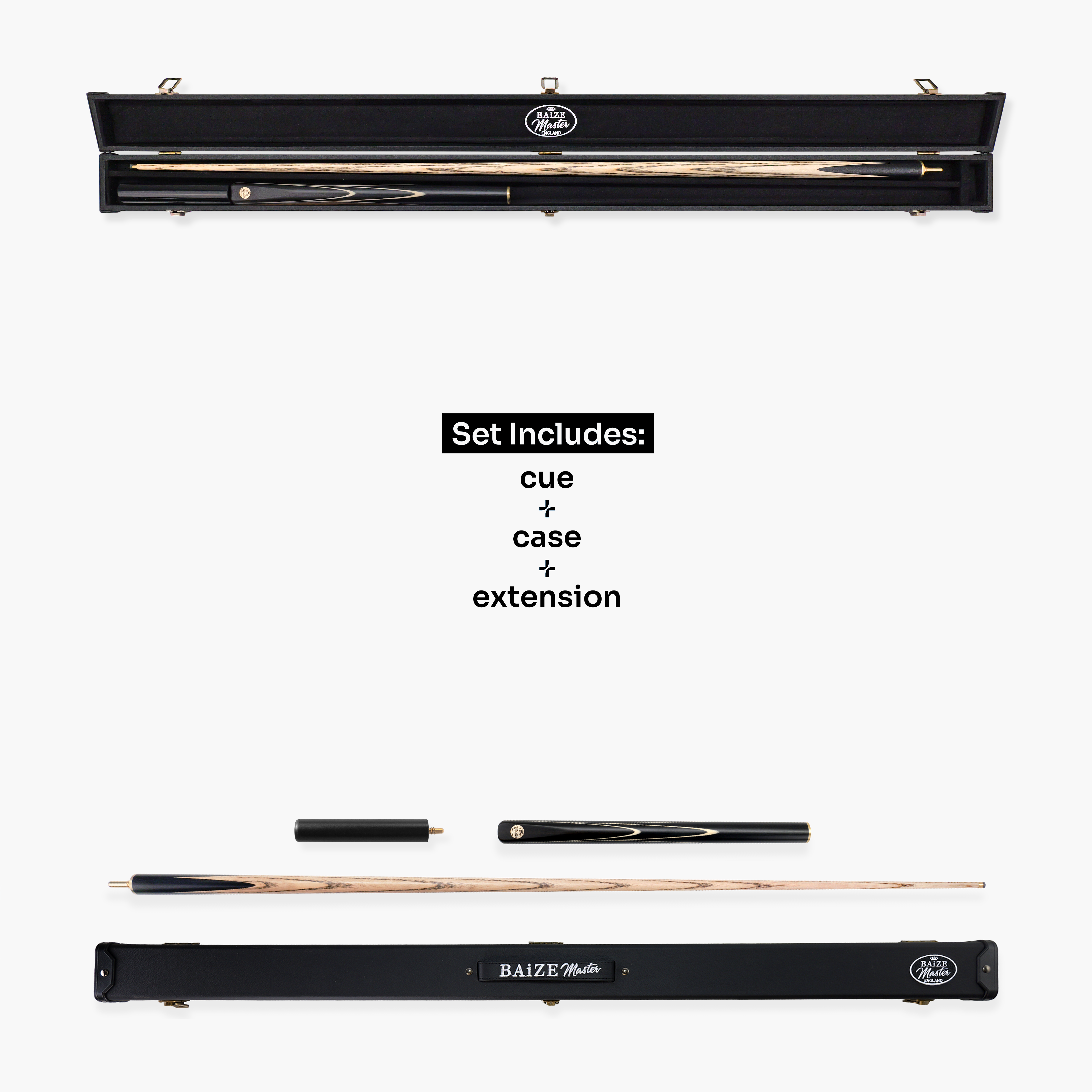 This cue and case set comprises the Baize Master Marksman cue, a 6 inch mini butt and a Baize Master Deluxe Black Hard Case to neatly house the whole set.