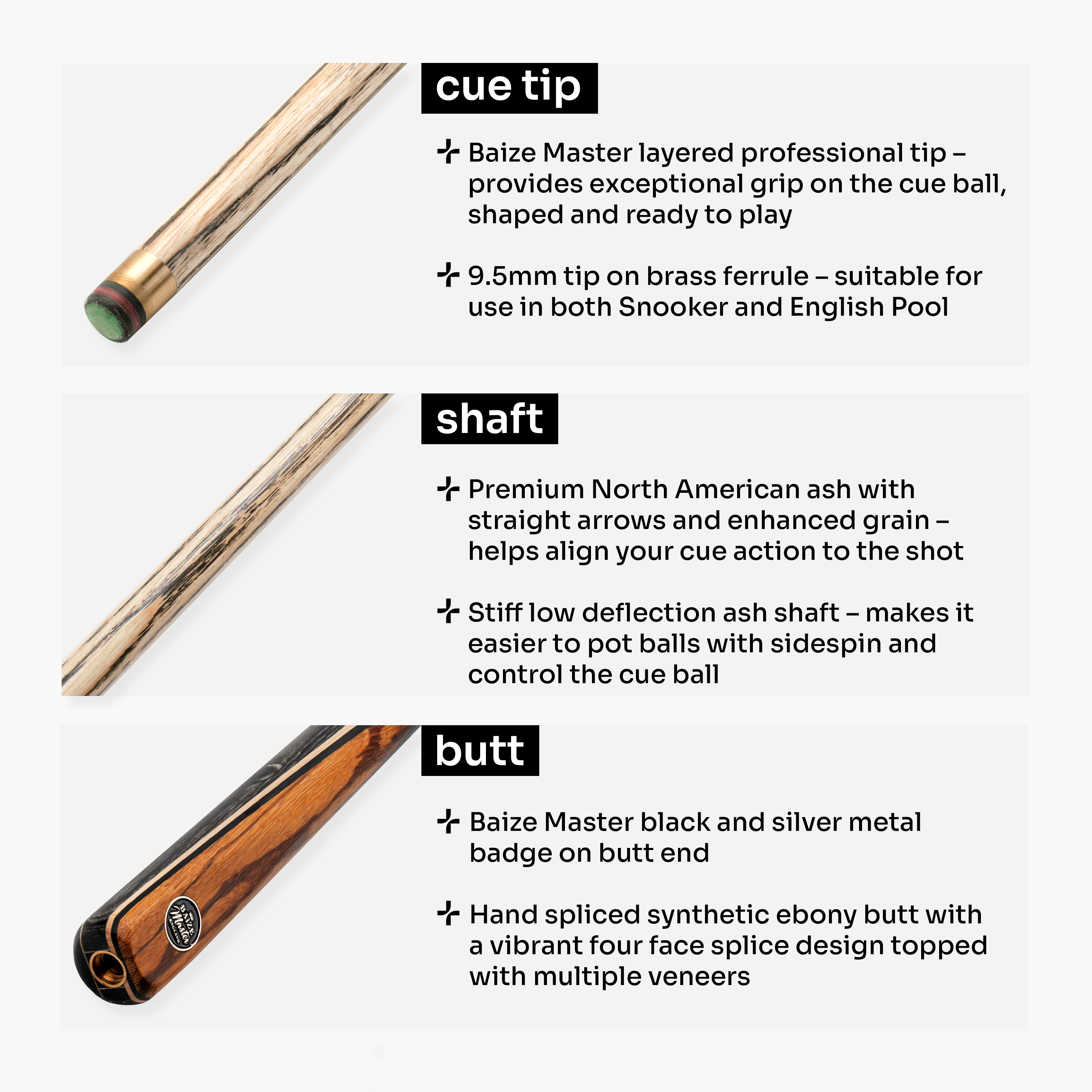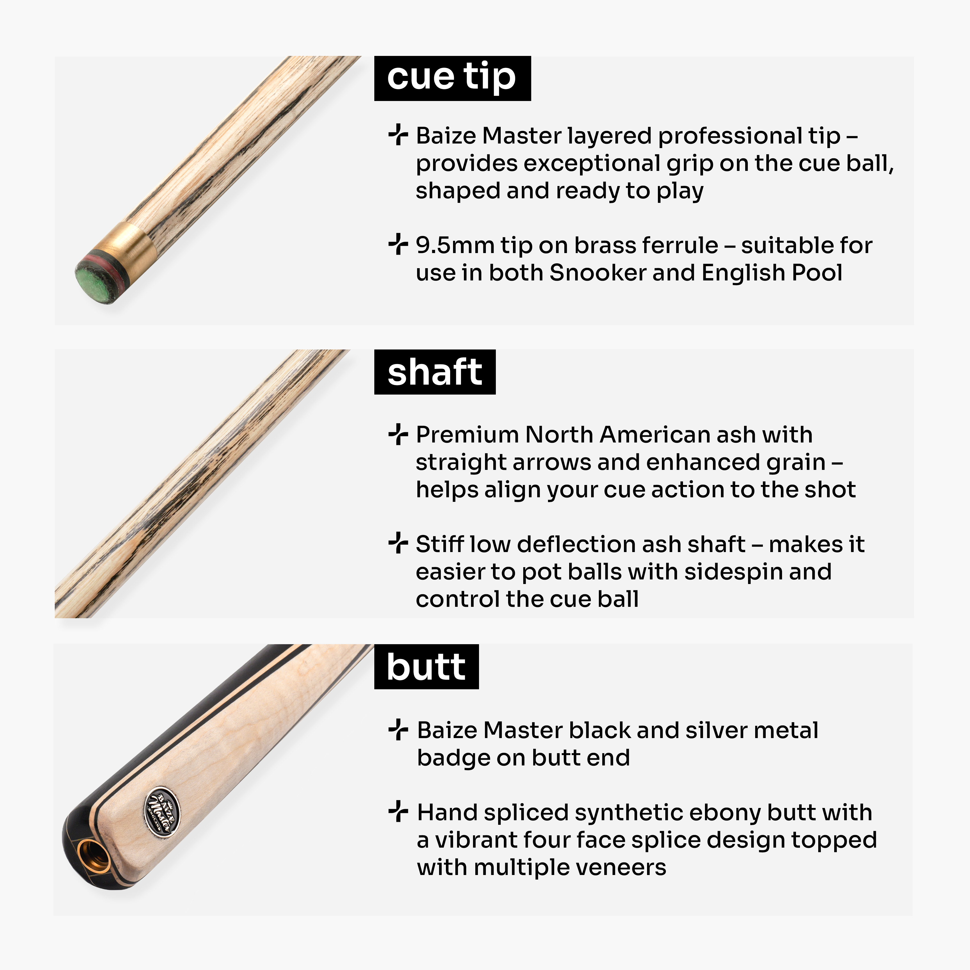 Fitted with a Baize Master layered professional leather tip that provides exceptional grip on the cue ball, the cues are supplied ready for action. The 9.5mm tip size makes it suitable for use in both Snooker and English Pool.