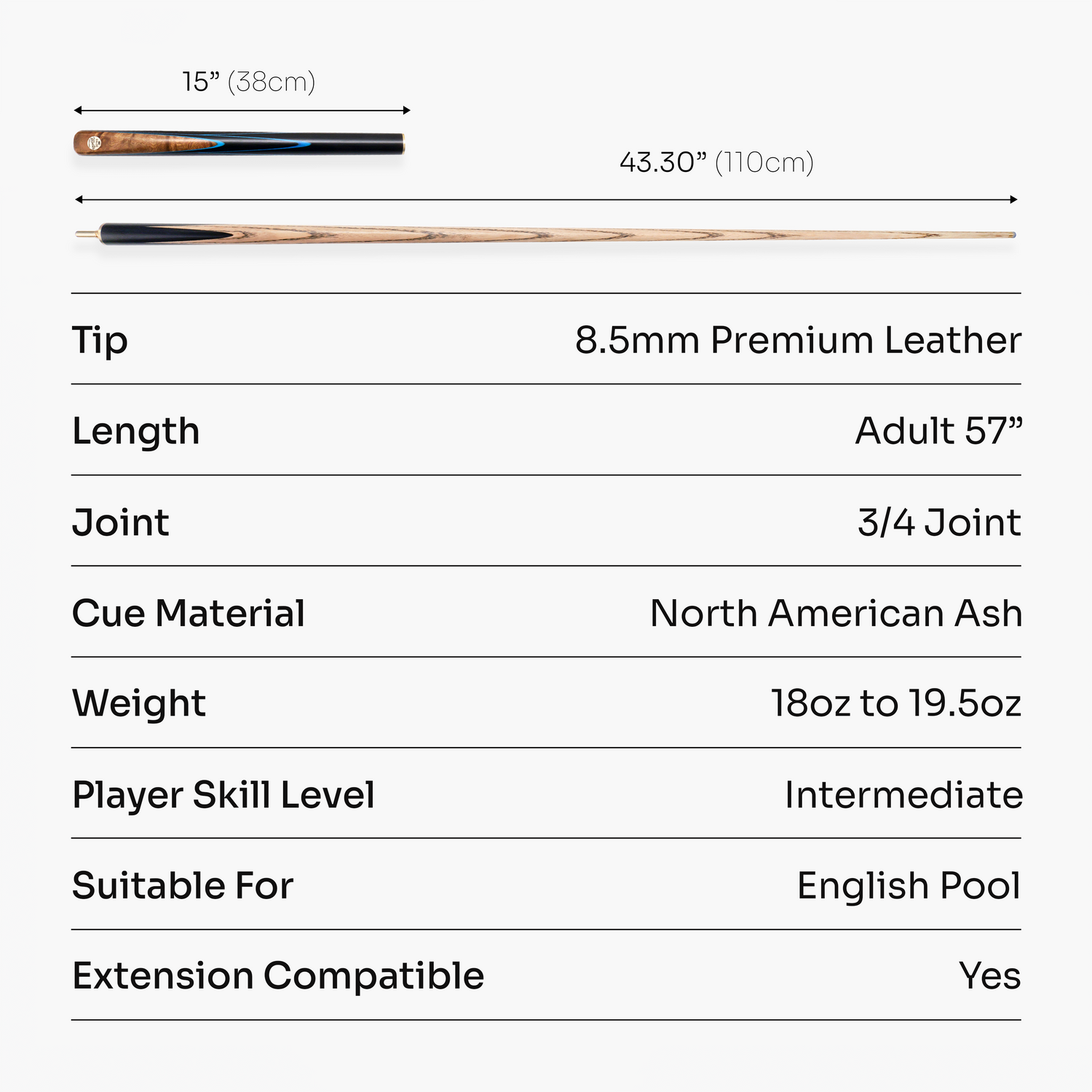 With an 8.5mm Baize Master Blue Pressed leather tip on polished brass ferrule, it is supplied ready for action and is ideal for precision cue ball control in English pool. Coupled with a stiff low deflection North American ash shaft with straight arrows, these cues make it easier to pot balls with side spin and control the cue ball.