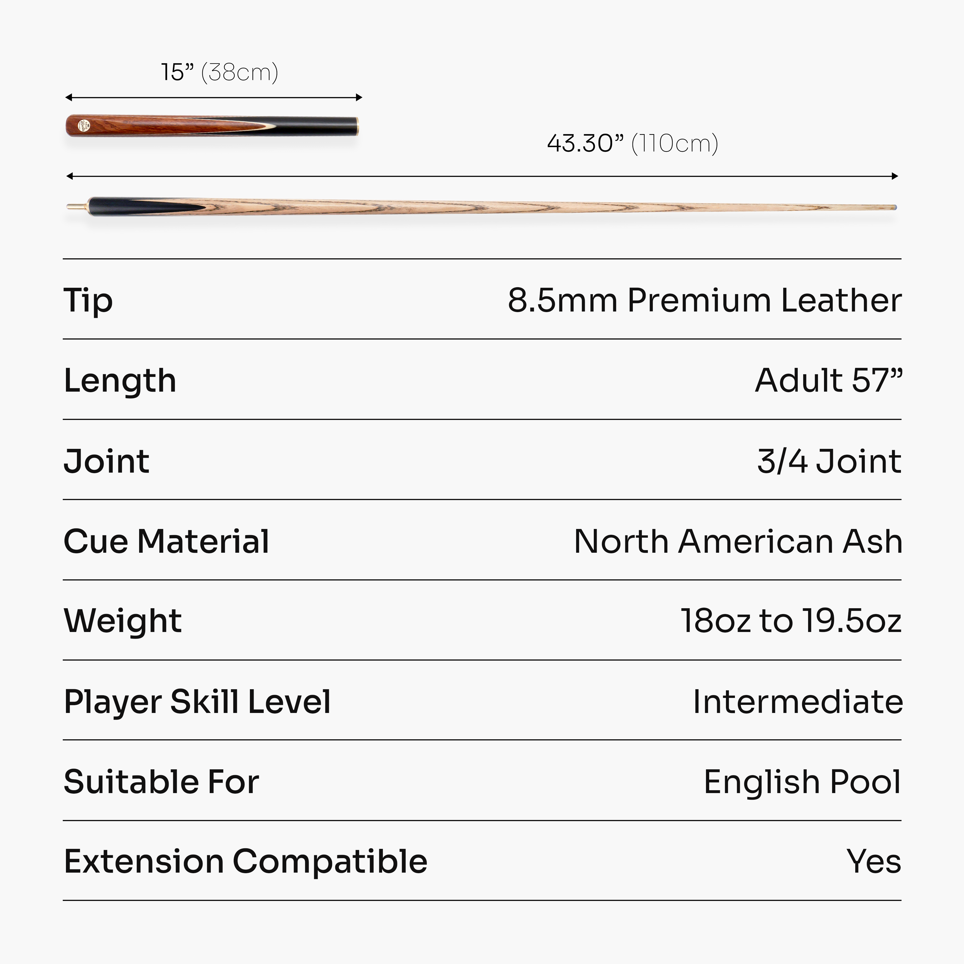 - 57 inch cue with a ¾ joint - great feel for the shot and convenience in transport