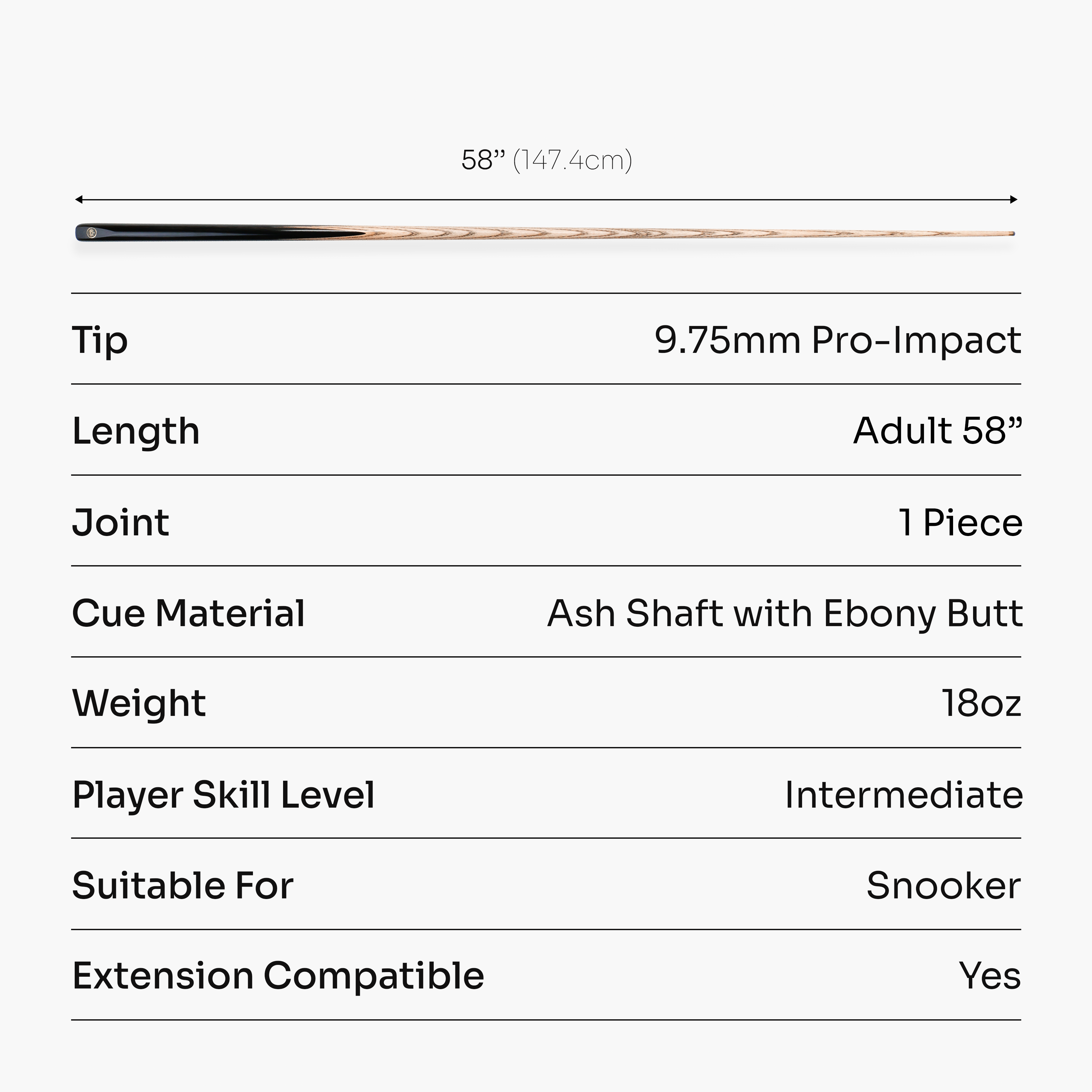Baize Master CLASSIQUE 58 Inch One Piece Ebony Butt Snooker Cue with Baize Master Pro Impact 9.75mm Tip