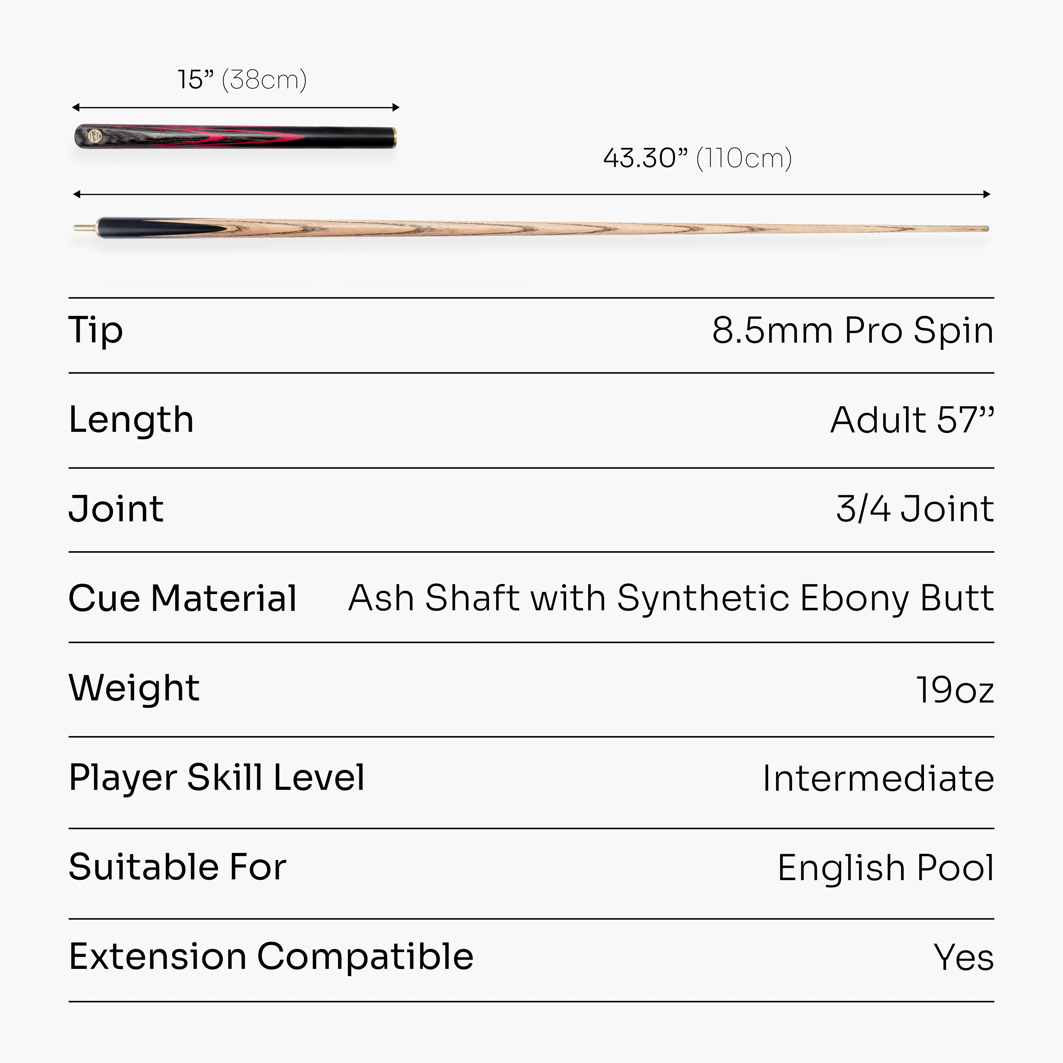 - 57 inch cue with a ¾ joint - great feel for the shot and convenience in transport