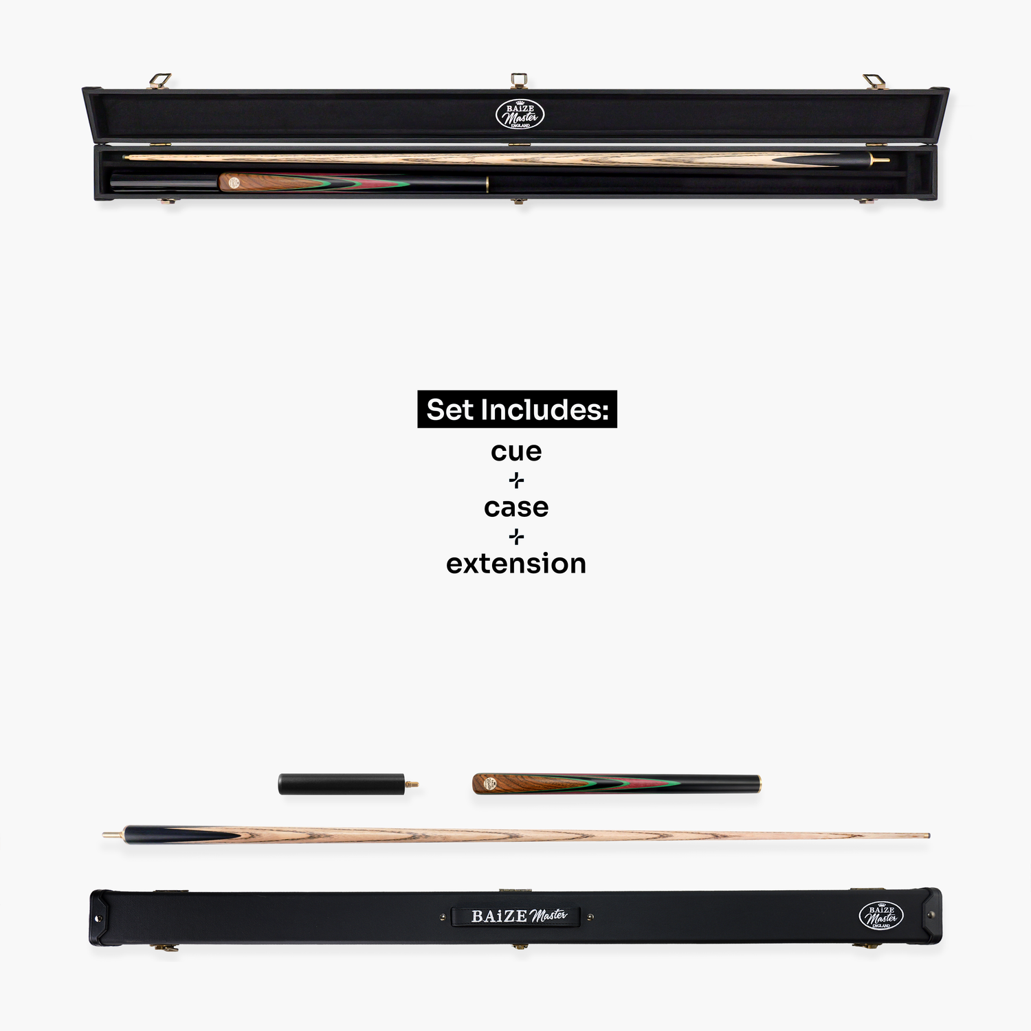 This cue and case set comprises the Baize Master Marksman cue, a 6 inch mini butt and a Baize Master Deluxe Black Hard Case to neatly house the whole set.
