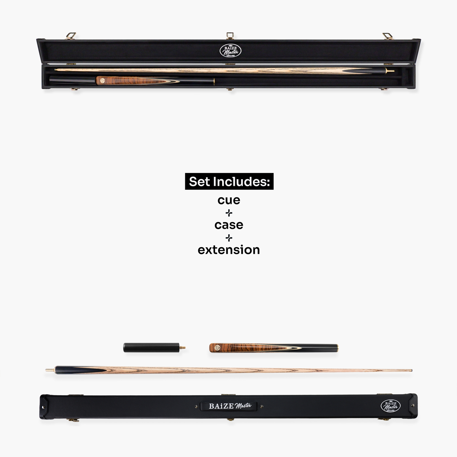 This cue and case set comprises the Baize Master Marksman cue, a 6 inch mini butt and a Baize Master Deluxe Black Hard Case to neatly house the whole set.