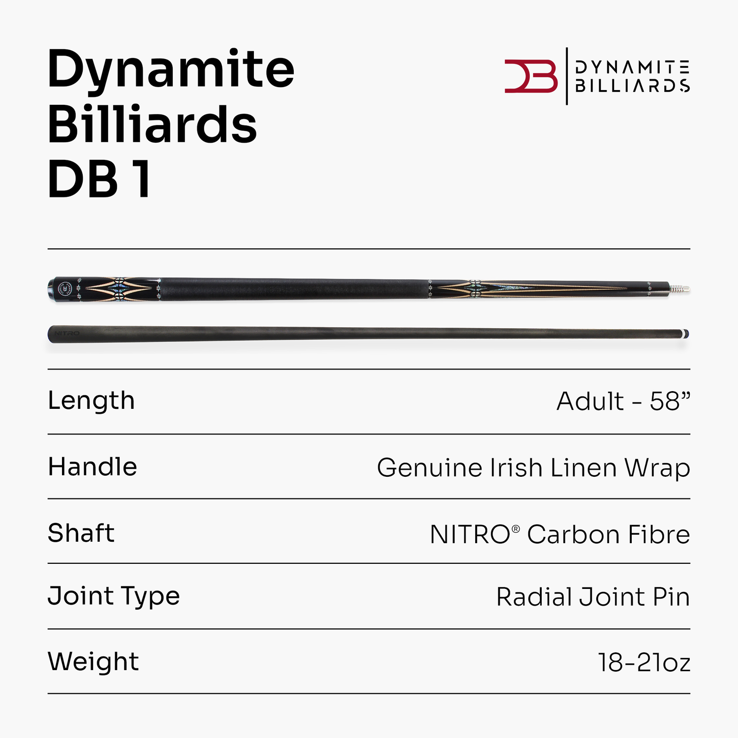 Dynamite Billiards DB1 Nitro Carbon Fiber American Pool Cue – 12.5mm HOW Black Tip – Designed by Darren Appleton