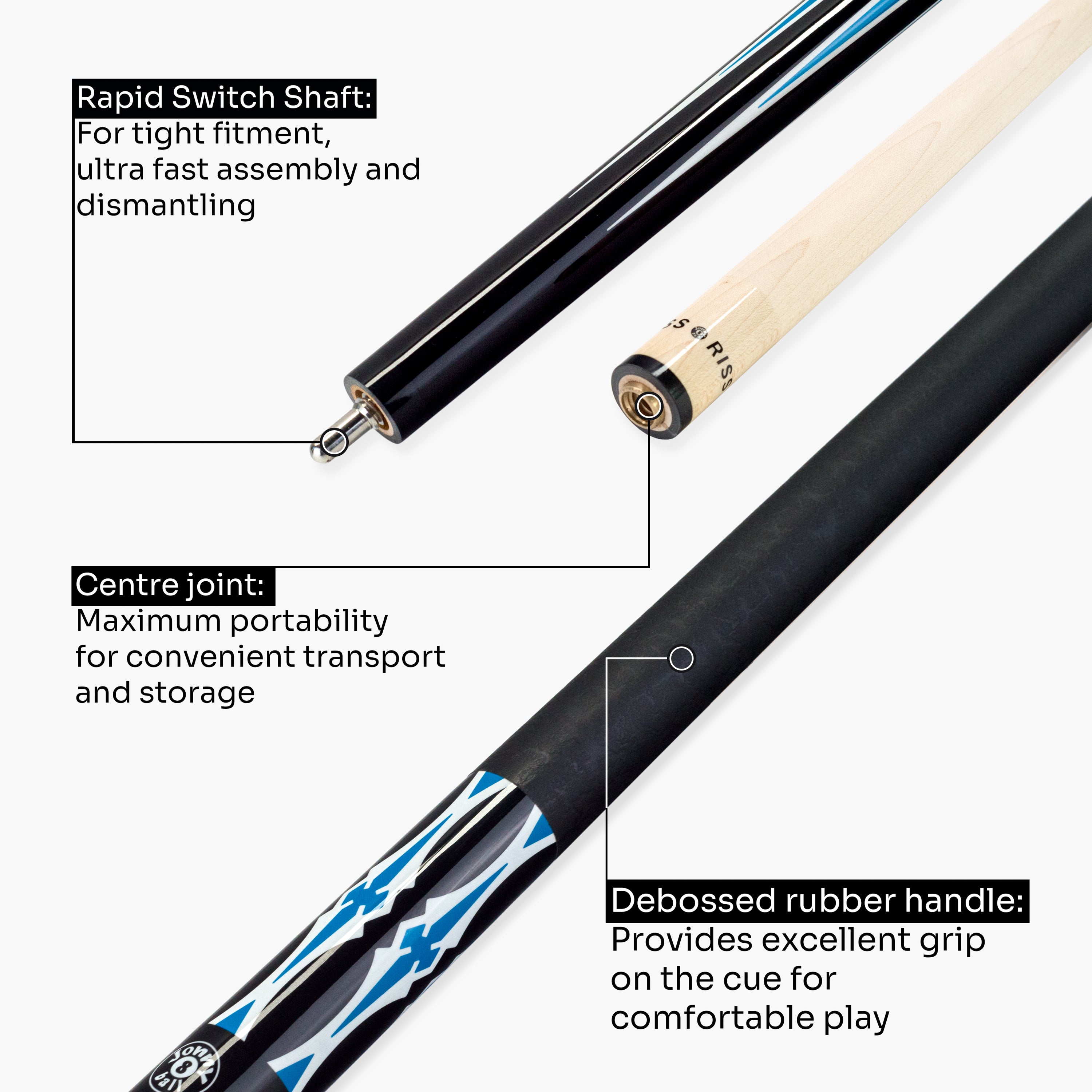 - Premium rubberised handle - excellent grip on the cue for comfortable play