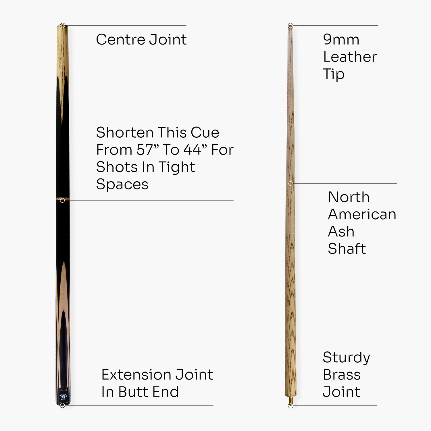 - Easily shorten this cue from 57” to 44” for taking shots in tight spaces