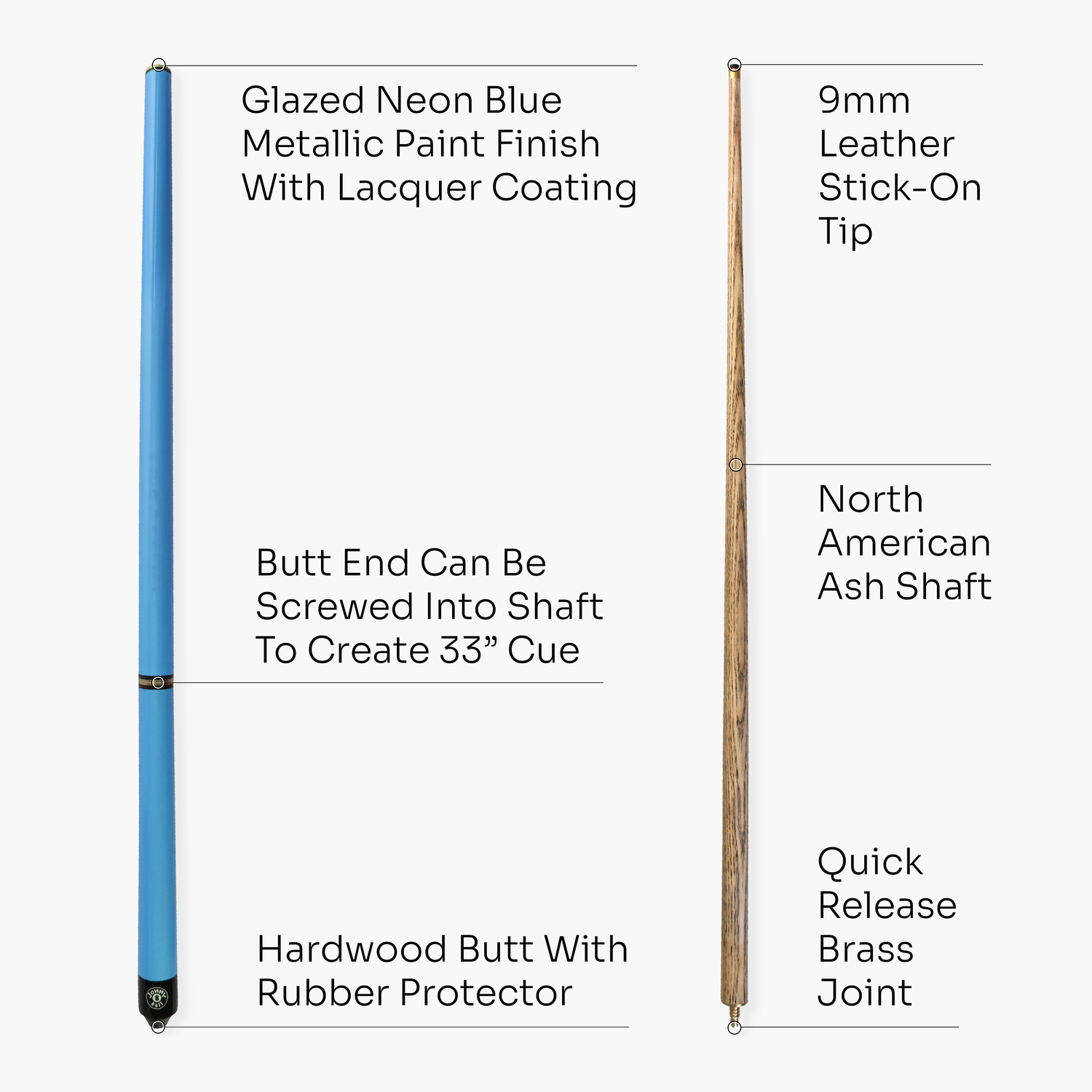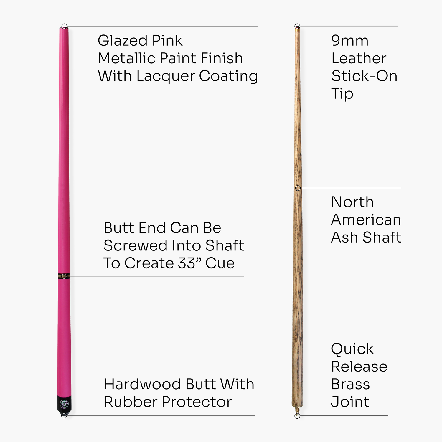- Butt end can be screwed into shaft to create 33" cue