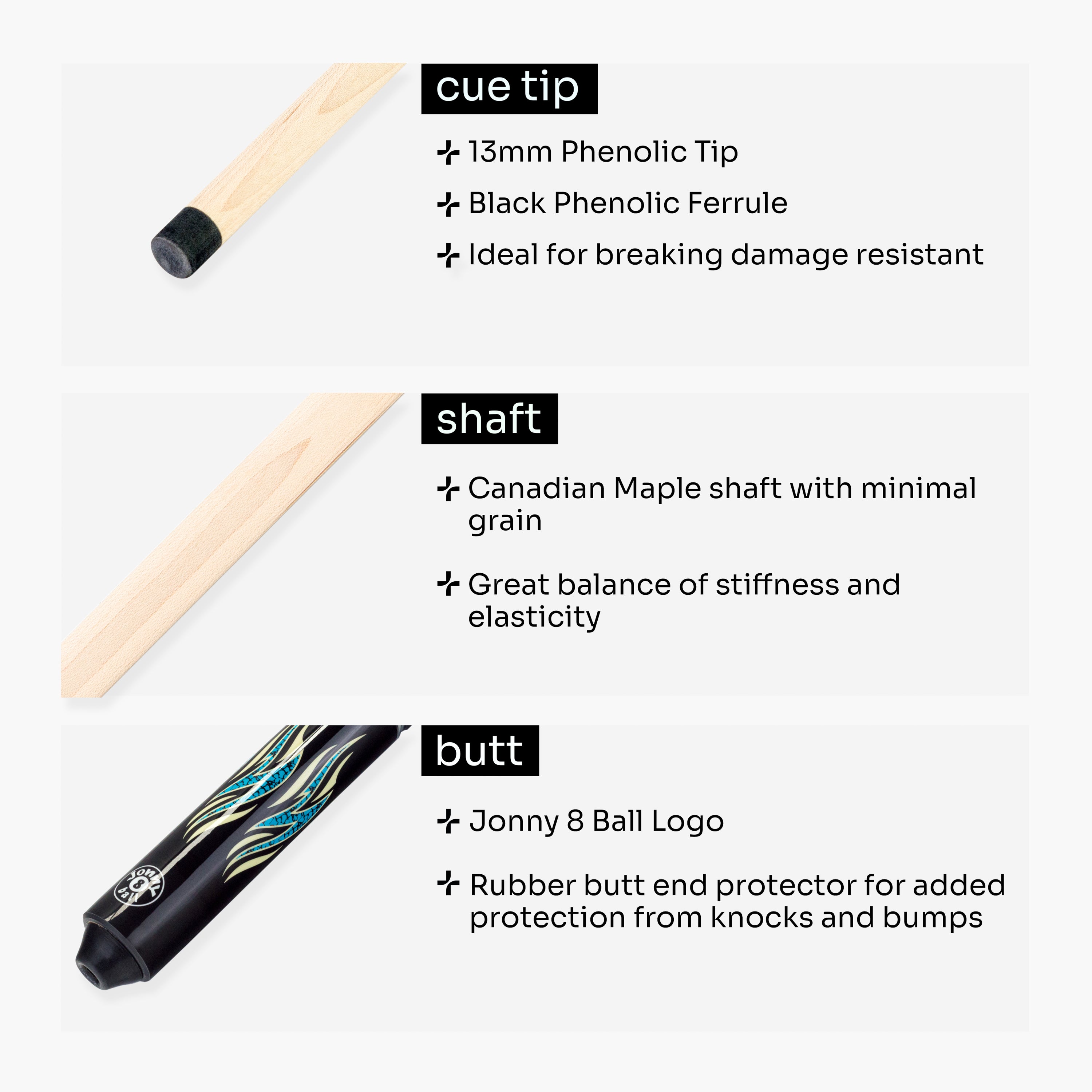 Jonny 8 Ball Aqua RISS 2 Piece American Pool Break and Jump Cue with 13mm Phenolic Tip