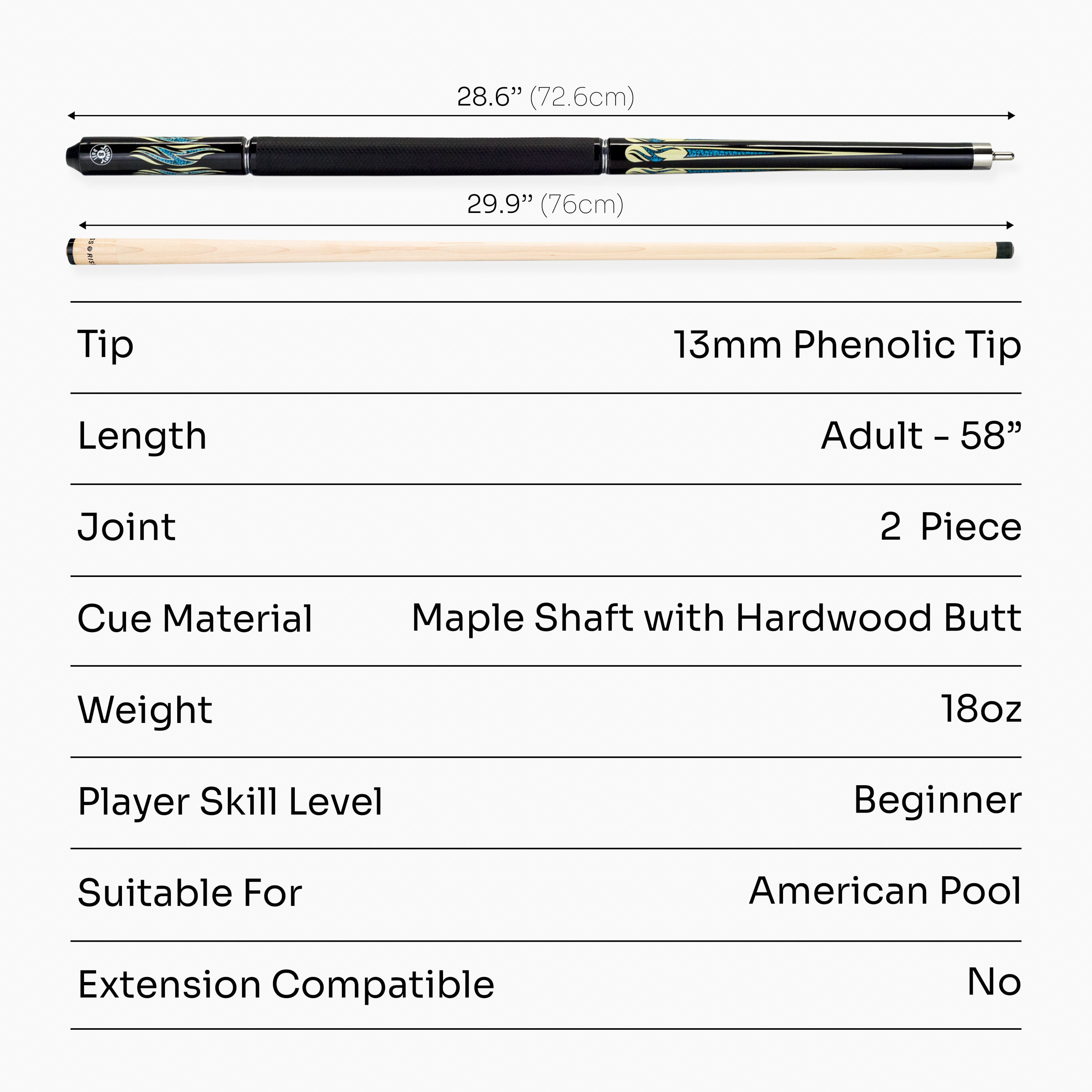 - 58 inch (147cm) long cue - butt and shaft are equal length