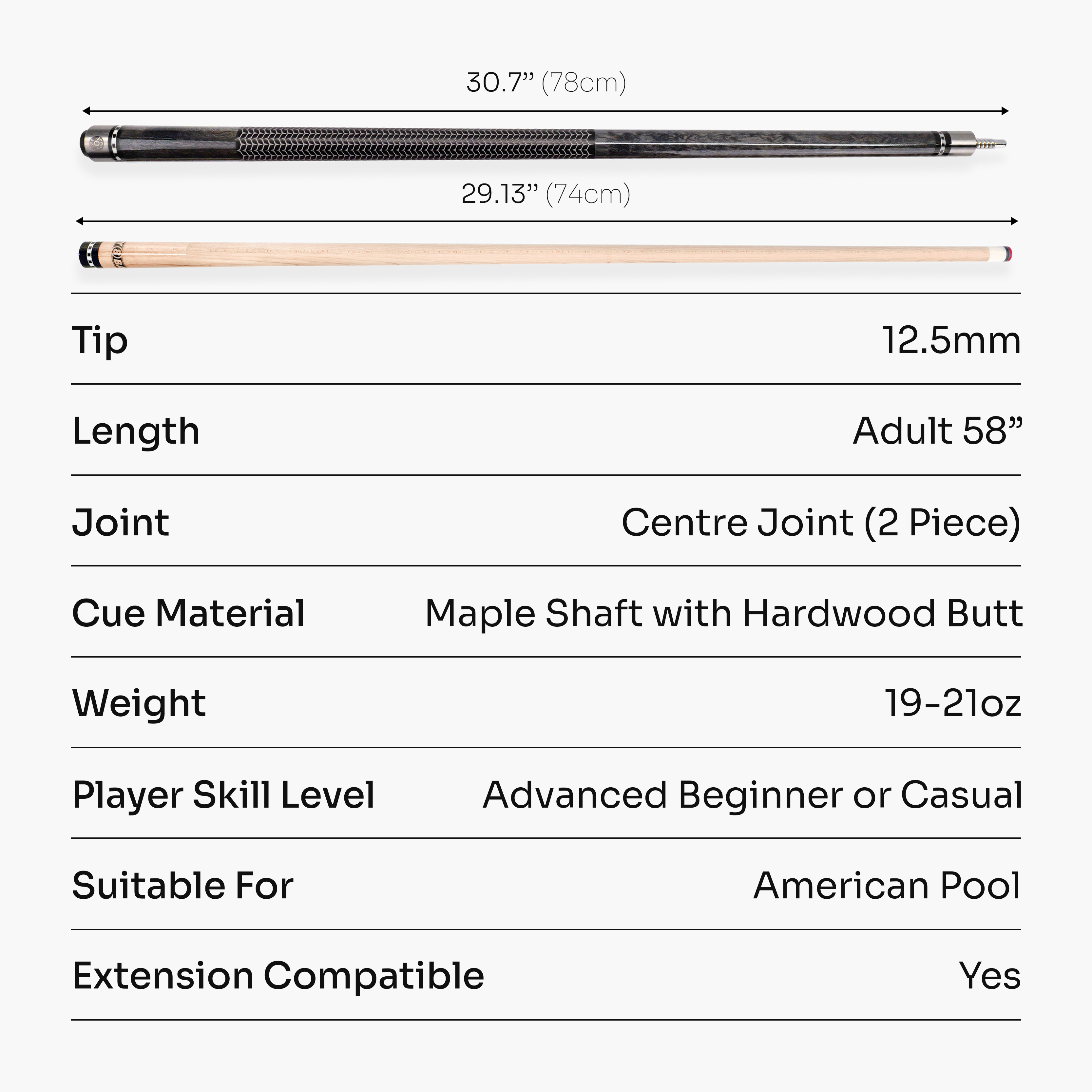 - Black Polyurethane (PU) wrap with an embossed woven design - for a comfortable grip and handling of the cue
