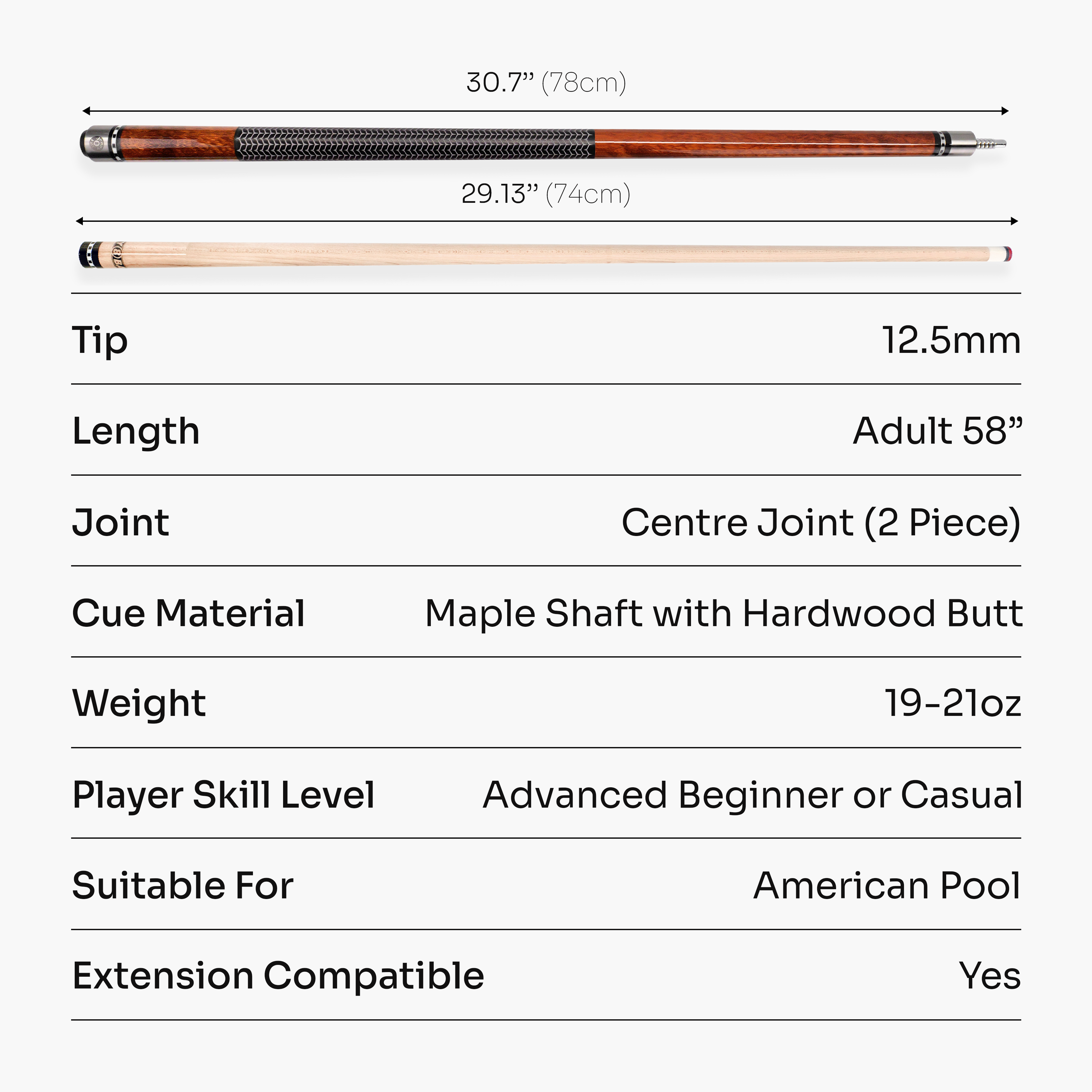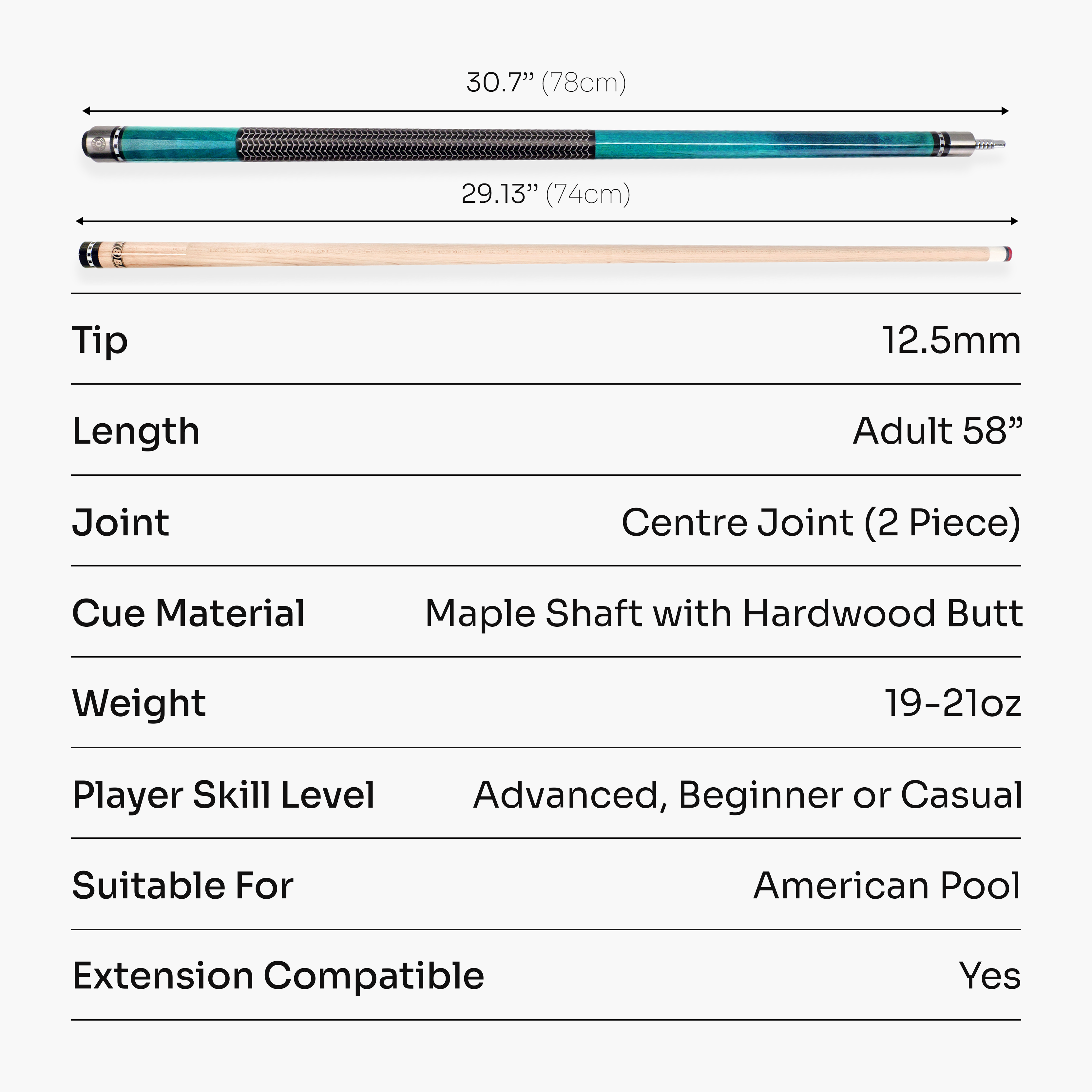 The PU handle features an embossed woven design which gives players a great grip on the cue for comfortable handling. Combined with an eye-catching colour-stained design, the Ironweave cues provide the perfect balance of style, comfort and playability.