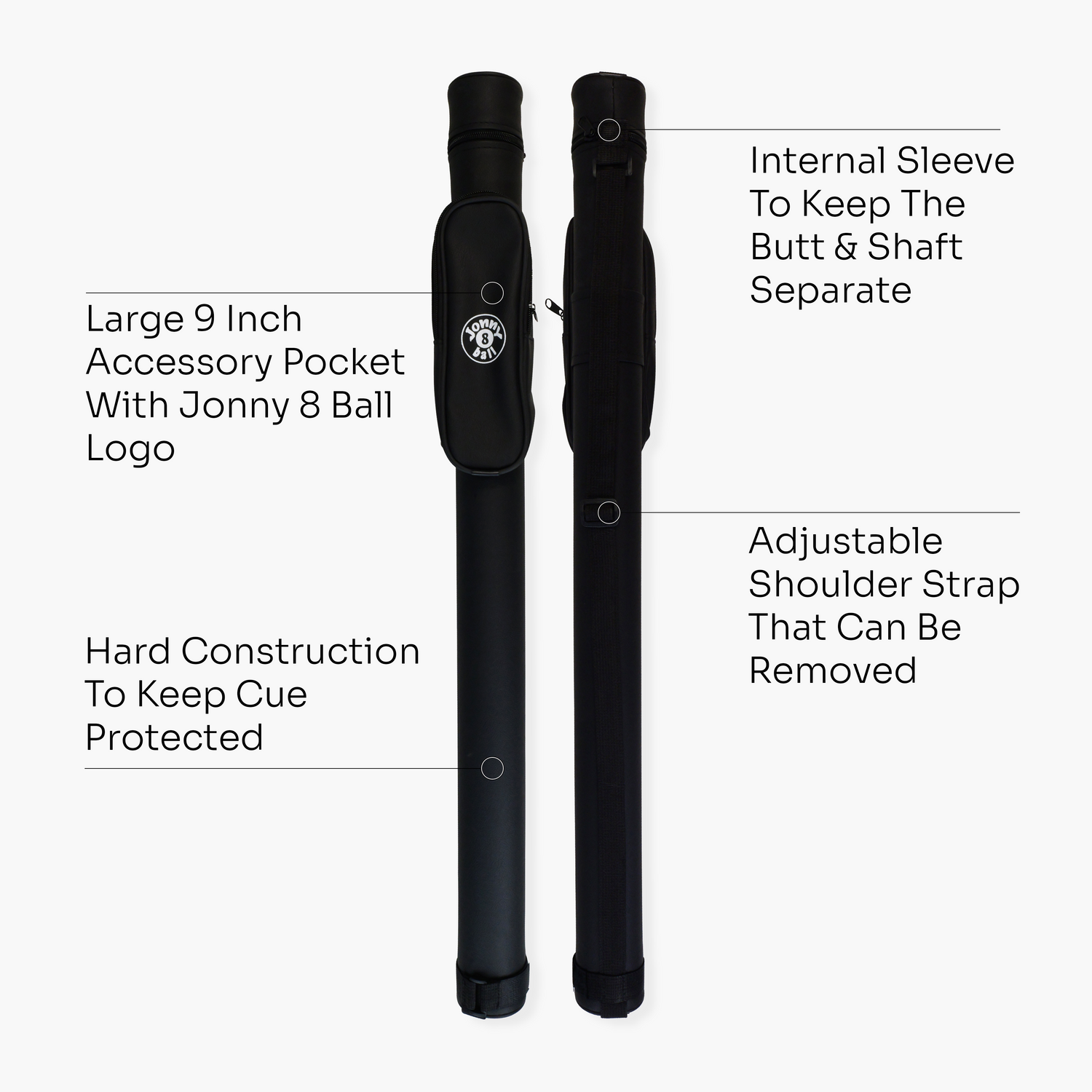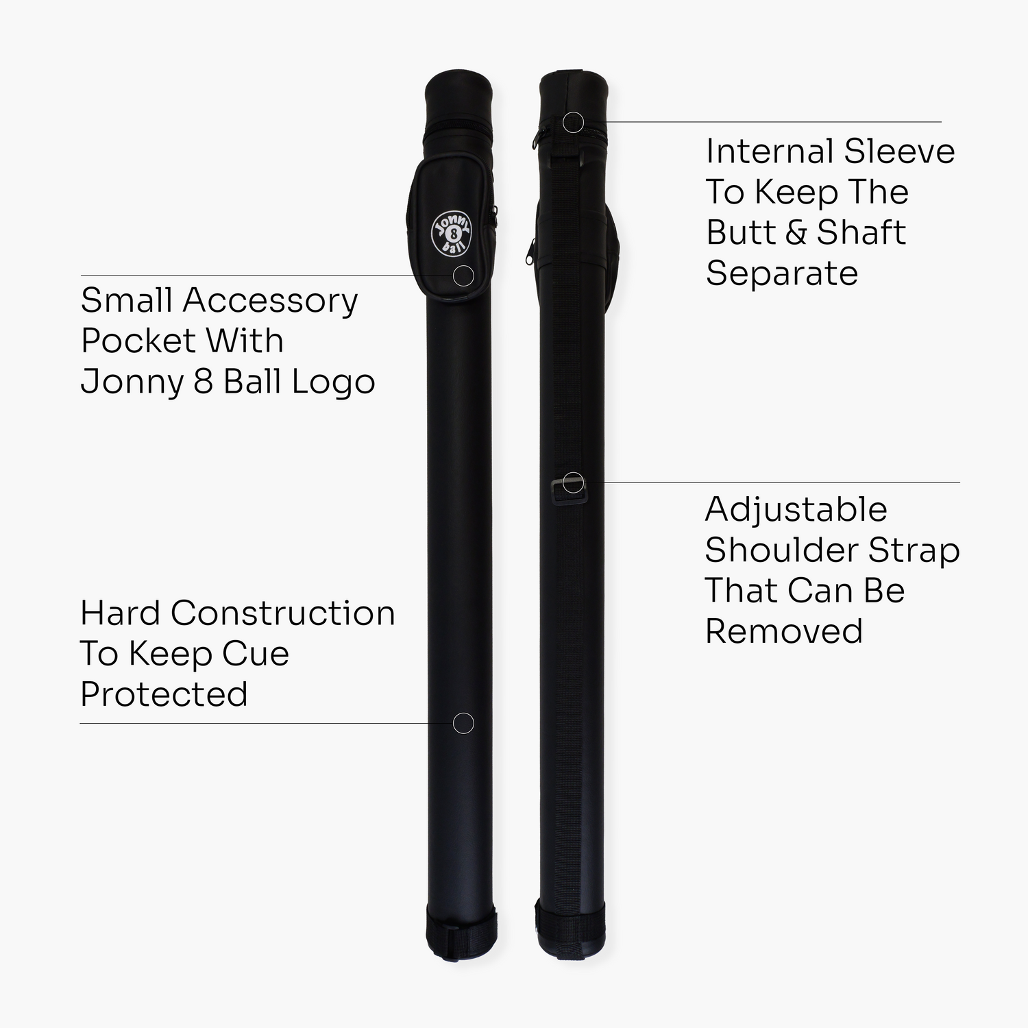 Jonny 8 Ball Black Tubular Cue Case + Shoulder Strap - Holds 2pc Snooker or Pool Cue - Small Pocket is backordered and will ship as soon as it is back in stock.