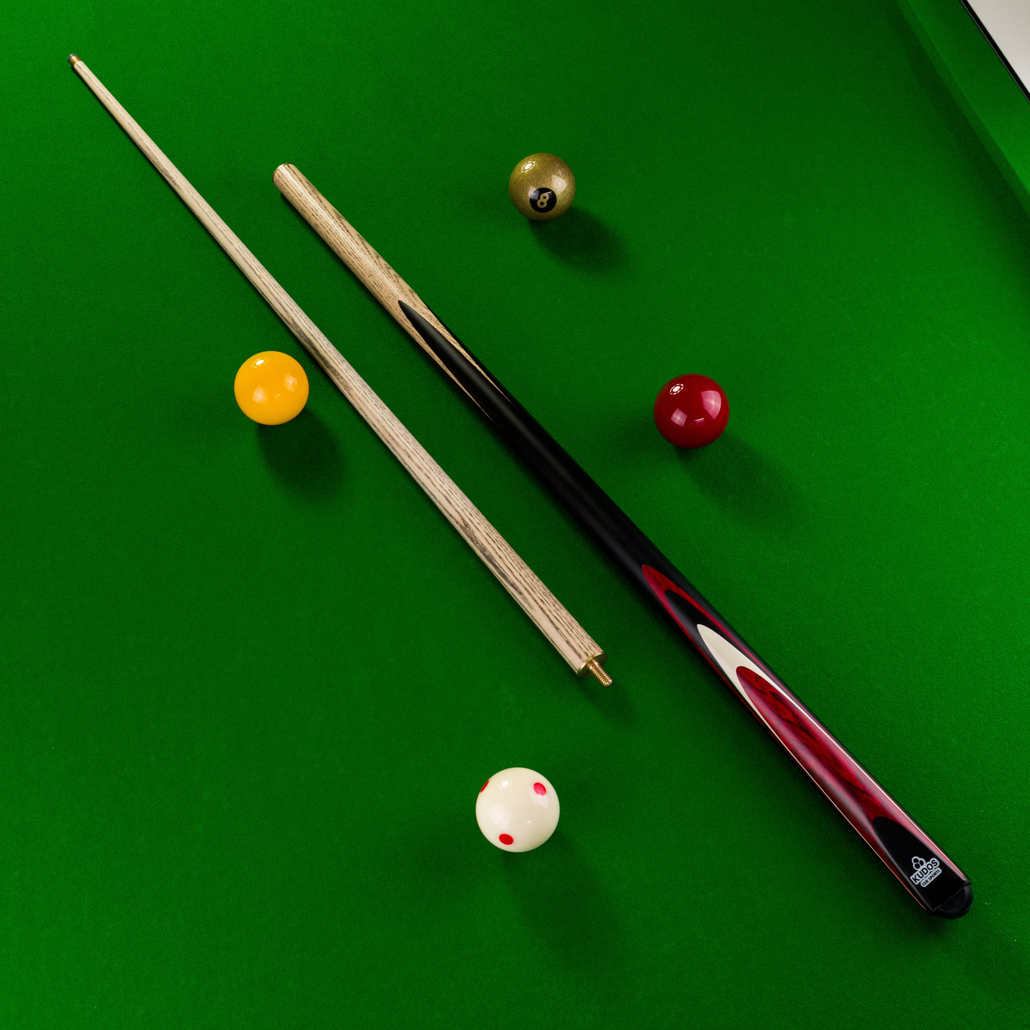 - A two-piece cue with a brass joints, suitable for both snooker and pool