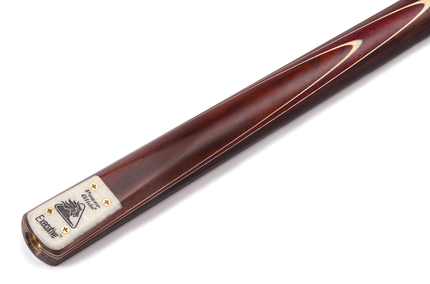 The PowerGlide Executive is a premium snooker pool cue with a matching ash shaft. With a 9.5mm leather tip, it can be used for both snooker and English pool. It has a hand spliced rosewood butt with natural and burgundy veneers and comes with a matching rosewood 6 inch mini butt extension.