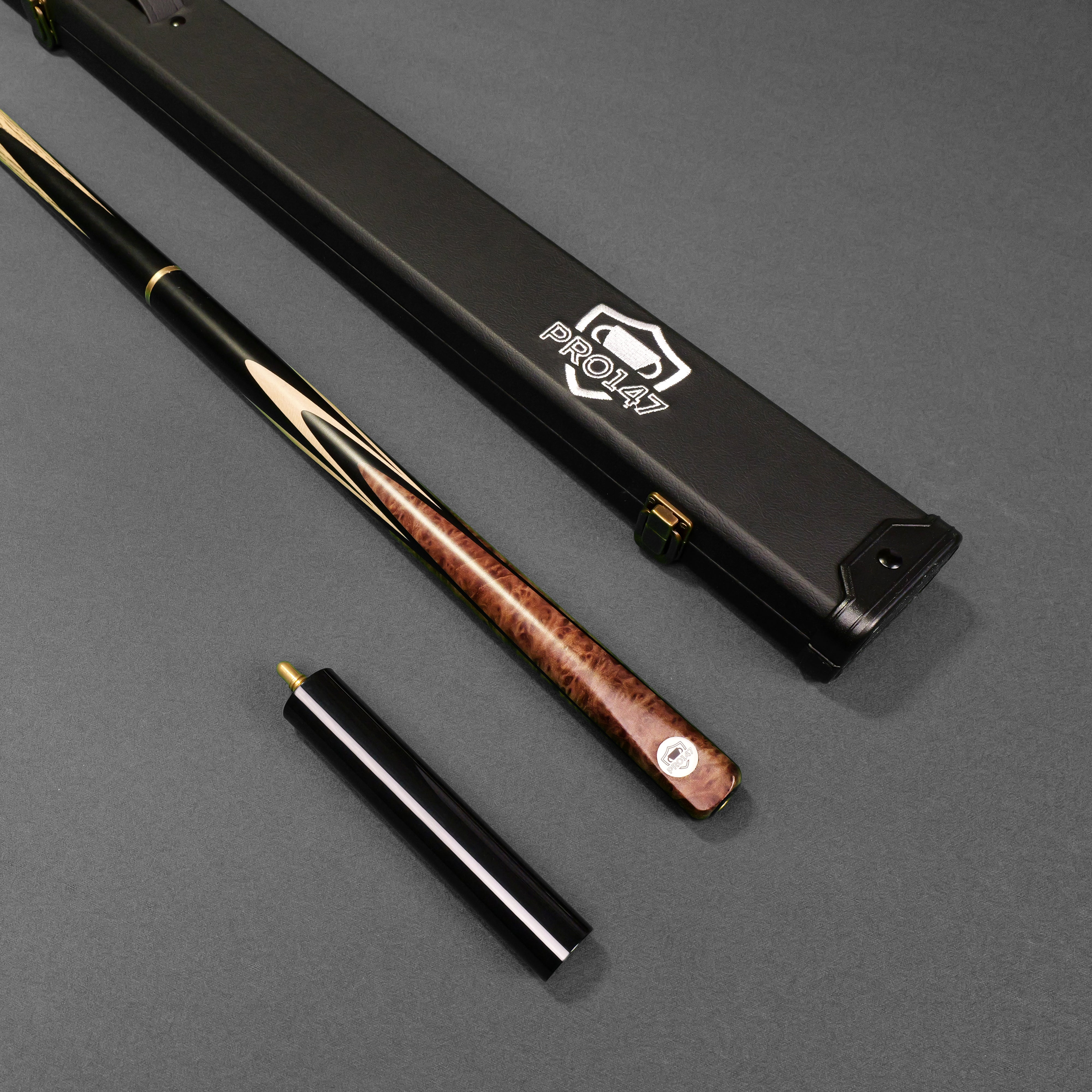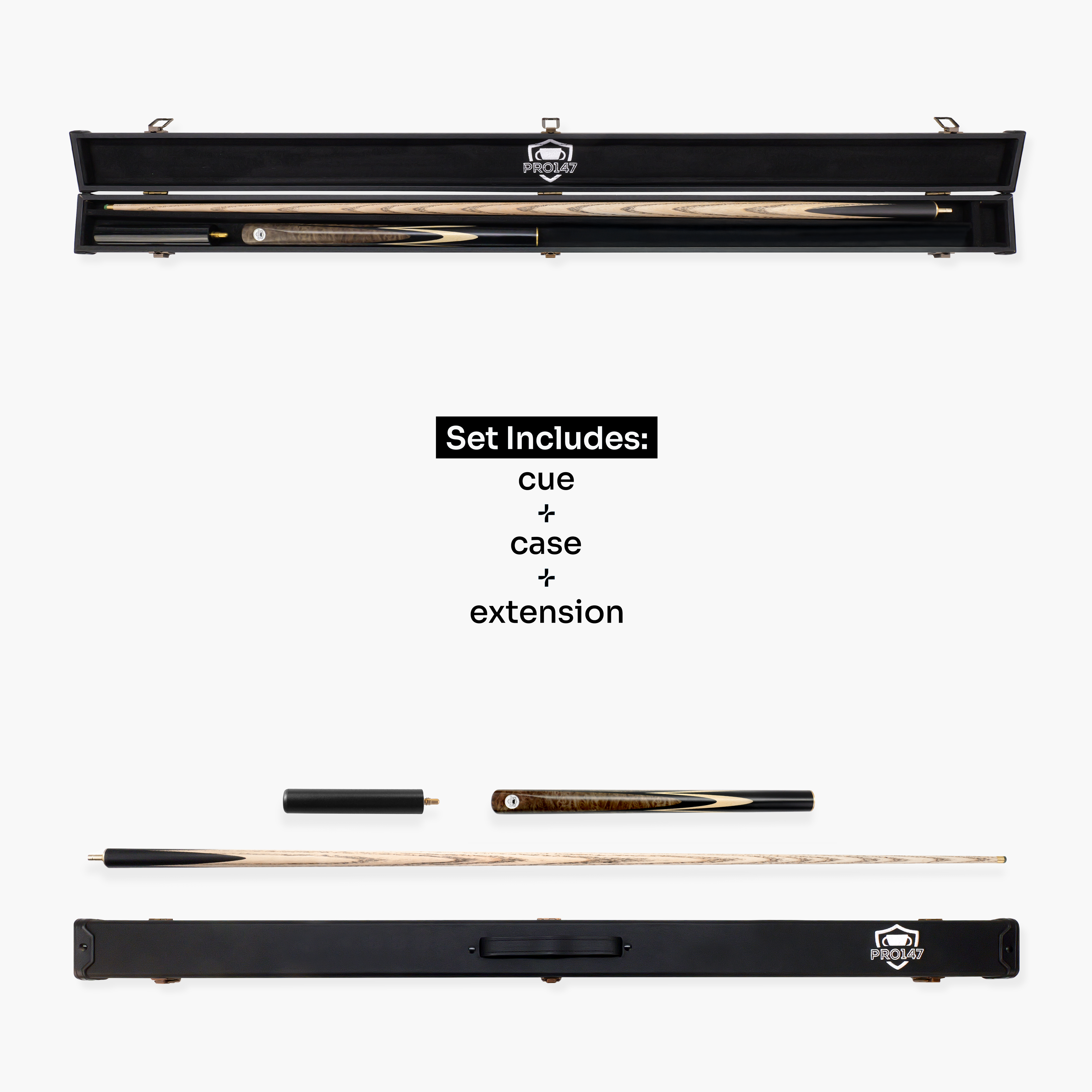 This cue and case set comprises the PRO147 Maple Eclipse Cue, a 6 inch mini butt and a PRO147 Black Hard Case to neatly house the whole set.