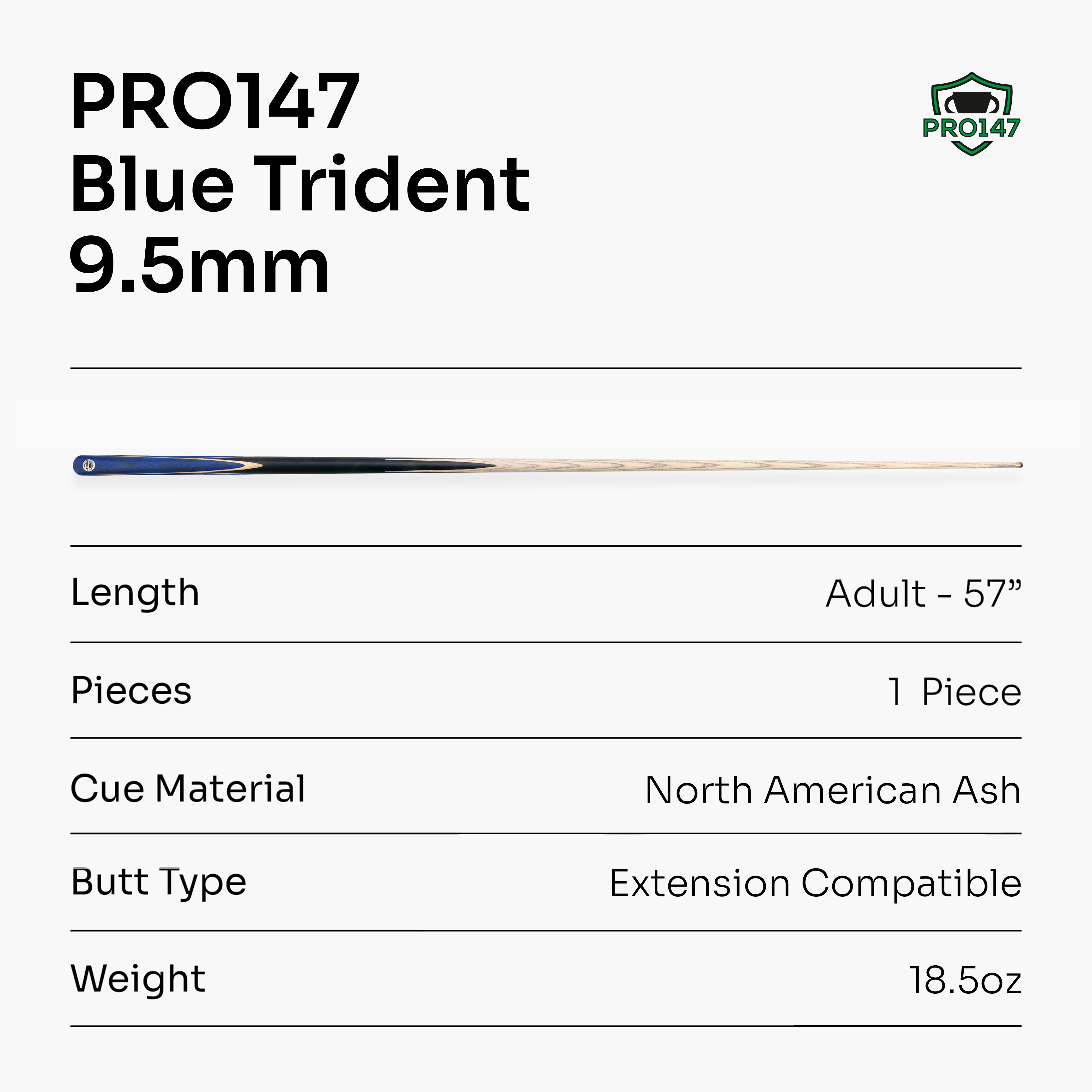 PRO147 Trident 57 Inch 1 Piece Hand Spliced Ash Snooker and Pool Cue with 9.5mm Tip - Blue is backordered and will ship as soon as it is back in stock.